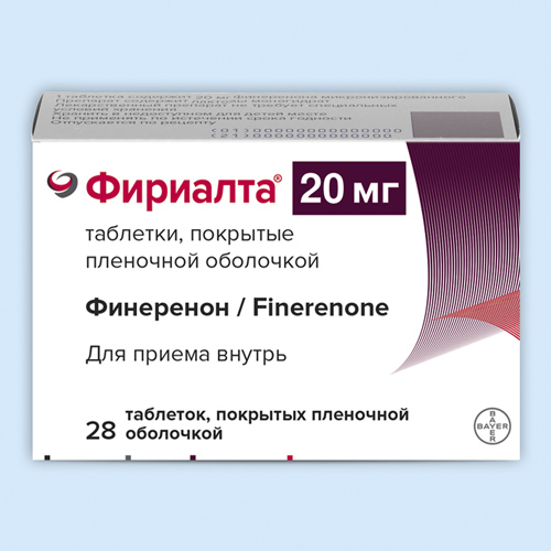 Исследования FIDELIO-DKD и FIGARO-DKD изучали влияние финеренона по сравнению с плацебо на почки и сердечно-сосудистую систему у взрослых пациентов с ХБП и СД2. Пациенты получали всю стандартную терапию, включая максимальную переносимую дозу ингибитора АПФ или блокатора рецепторов ангиотензина (БРА). Пациенты с диагностированной сердечной недостаточностью со сниженной фракцией выброса и пациенты класса II-IV по NYHA были исключены по причине рекомендации класса 1A для терапии антагонистами минералокортикоидных рецепторов.